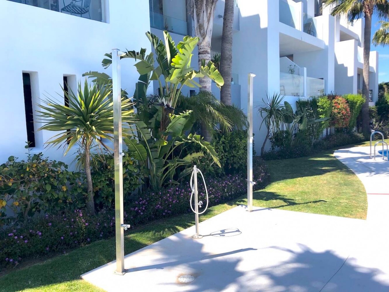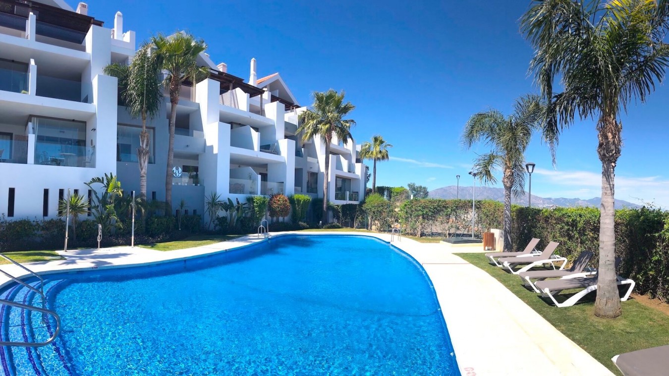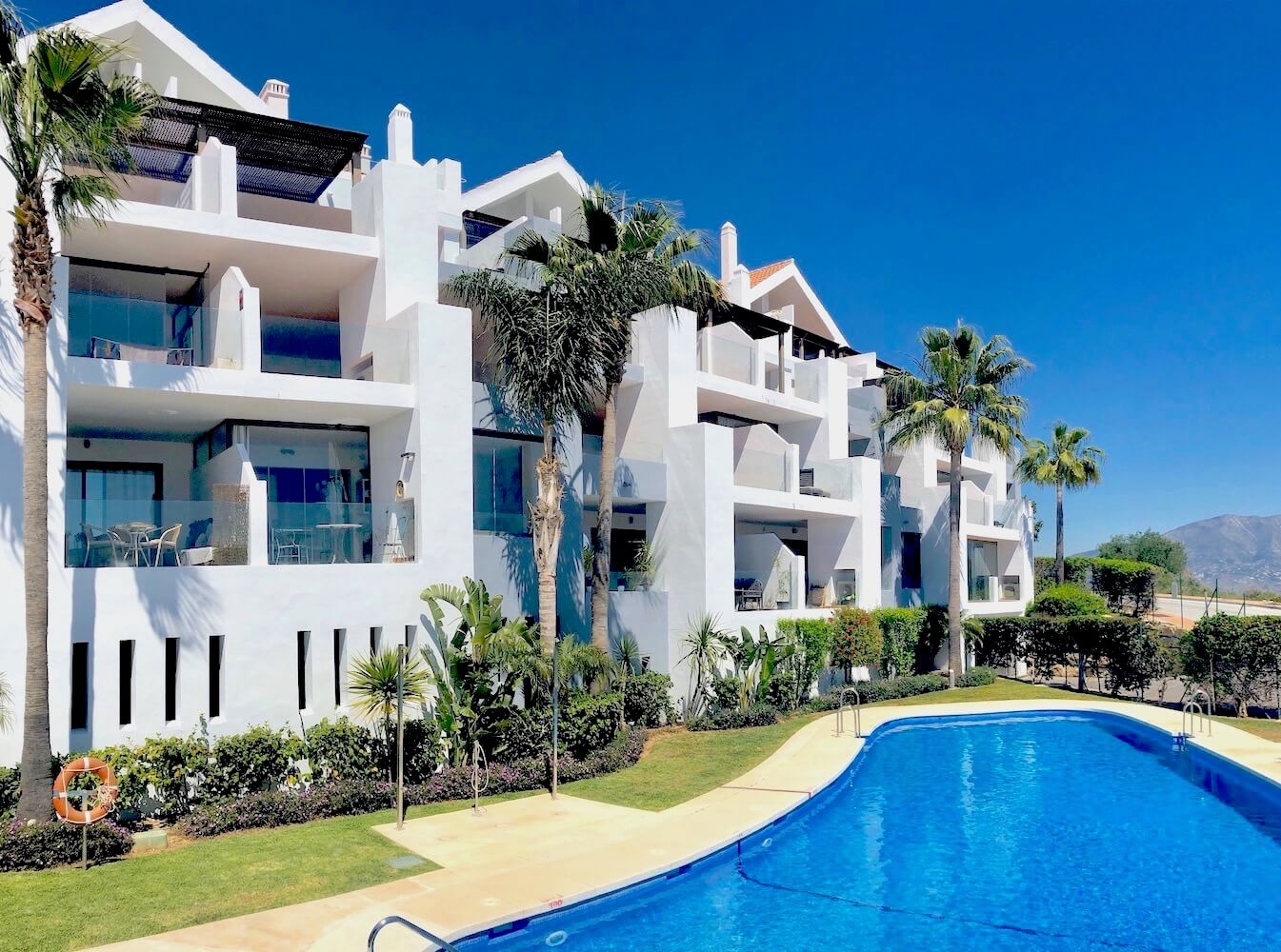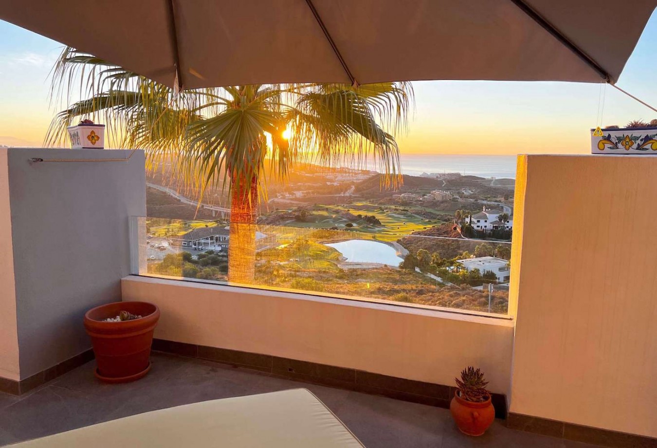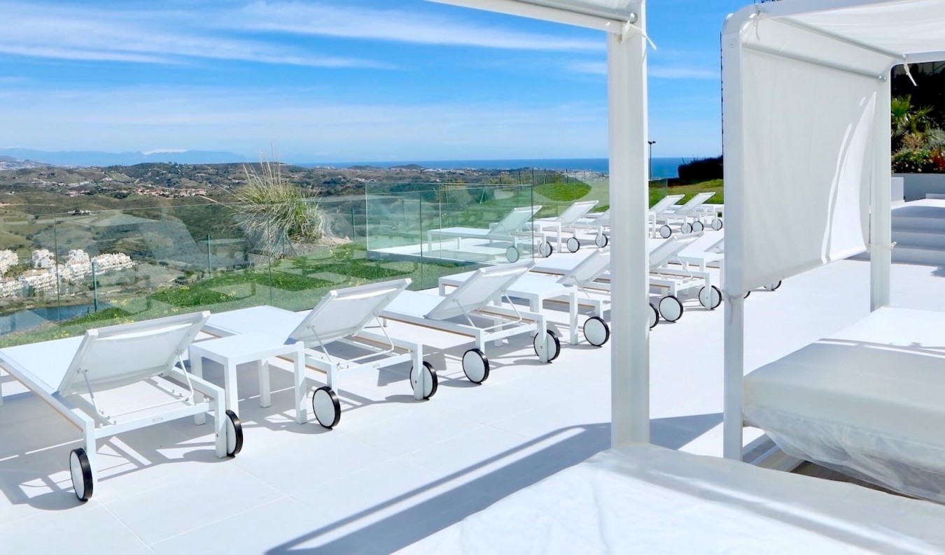 Discover this stunning modern furnished 2-bedroom self-catering holiday apartment located in the picturesque Los Cortijos, La Cala de Mijas. Overlooking the beautiful Calanova Golf course, this spacious and bright apartment is an ideal retreat for those seeking relaxation or a golfing getaway. With bright, south-facing interiors, enjoy all-day sunshine from the spacious all-year-around 40m² solarium terrace, complete with panoramic views and a covered area featuring a large pergola and collapsible parasol, plus retractable glass curtains to enjoy cooler winter evenings.